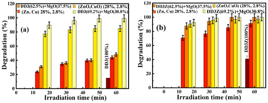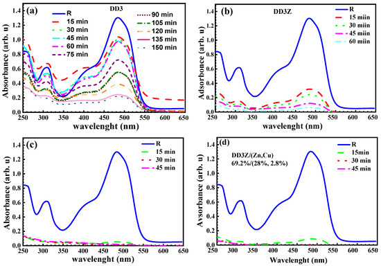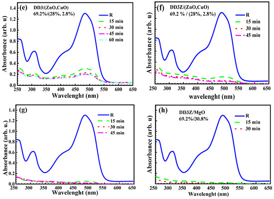 Solutions containing 25 mg/L of the dye for ceramic powders and 12.5 mg/L for ceramic slice samples were prepared. Ceramic slice samples coated with Cu-doped ZnO layers and 0.1 g of ceramic powders with varying proportions of ZnO-CuO/MgO were dispersed in 25 mL of the aqueous dye solution. For the ceramic slice samples, the suspensions were stirred under dark conditions for 30 min to establish adsorption–desorption equilibrium before being exposed to a 300 W xenon lamp with a UV cutoff filter (λ > 400 nm) at room temperature for 4 h. The 30 min stirring time under dark conditions was selected based on preliminary tests. UV-Vis spectrophotometry monitored the Orange II concentration overtime during these preliminary tests. It was observed that after 30 min of stirring in the dark, the dye concentration stabilized, confirming the establishment of adsorption–desorption equilibrium. No further significant decrease in absorbance was recorded beyond this point. Thus, 30 min was chosen as the optimal duration to ensure reliable photocatalytic activity measurements.The reaction mixture (Figure 7) was maintained at 25 °C using a circulating water bath throughout irradiation, and light intensity was controlled at 100 mW/cm2. Every hour, 2 mL aliquots were withdrawn and analyzed by UV-Vis spectrophotometry (Shimadzu UV-2600i from MOLTECH Angers, France) in the 250–650 nm wavelength range to monitor dye concentration changes. For the ceramic powder suspensions, the setup remained similar. Samples were collected every 20 min, centrifuged at 4000 rpm for 5 min to separate the catalyst, and then analyzed using UV-Vis spectrophotometry. Degradation efficiency was calculated by tracking the decrease in absorbance at 484 nm, the maximum absorption peak of Orange II. Control experiments were performed without the catalyst to verify that the dye degradation was due to photocatalytic activity and not photolysis. For ceramic slice samples tested under the 300 W xenon lamp, Orange II solutions without catalysts showed less than 3% degradation after 6 h. No significant decrease in dye concentration was observed during irradiation for powder samples tested under visible light. These results confirm that photolysis under the applied conditions was negligible and that the observed degradation is primarily due to the photocatalytic action of the synthesized materials.The choice of Orange II as a model pollutant reflects its frequent use in photocatalytic performance studies alongside other compounds like methylene blue, Rhodamine B, and tetracycline hydrochloride. Although UV-Vis spectroscopy served as the primary analytical tool in this study, advanced techniques like total organic carbon (TOC) analysis and high-performance liquid chromatography (HPLC) are often applied in similar work to provide deeper insight into mineralization processes.