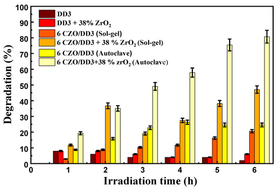 Figure 11a,b show the pure DD3 and DD3 + 38 wt.% ZrO2 substrates, respectively, with (b) displaying a denser, more uniform surface. Figure 11c,e depict CZO layers on DD3 prepared by sol–gel and autoclave methods [33,51]. The sol–gel method (c) produces a more uniform, finer-grained surface than the autoclave method (e), showing larger, more distinct crystallites. Similarly, Figure 11d,f show CZO layers on DD3 + ZrO2 [33], with the sol–gel method (d) again yielding a smoother, more homogeneous surface than the autoclave method (Figure 11f) [51]. Recent studies have provided valuable insights into the morphological characteristics of photocatalysts prepared through different methods. Aroob et al. [83] demonstrated that green-synthesized CuO nanoparticles exhibit well-defined surface structures with optimal photocatalytic activity, consistent with our observations of uniform morphology in sol–gel-derived samples. The autoclave method’s tendency to produce larger crystallites finds strong support in the work of Ahmadpour et al. [84], who systematically investigated substrate surface treatment effects on hydrothermal ZnO nanostructure formation. Their findings on the relationship between synthesis parameters and particle morphology directly corroborate our results regarding preparation method-dependent surface characteristics. Table 3 provides a concise comparison between these contemporary findings and our current study, highlighting methodological consistencies and novel advancements in understanding how preparation techniques influence ceramic photocatalyst properties.