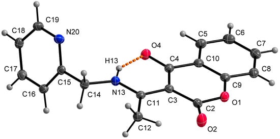 Notably, in 1H NMR spectra of both the free ligand and the complex show a downfield shift for the proton of the NH11 group upon formation of an H-bond with the oxygen atom of the carbonyl group C4=O. This shift to higher frequency, indicative of H-bond formation, results from a decrease in diamagnetic shielding due to a reduced electron density near the hydrogen [30]. The formation of the H-bond was further confirmed by X-ray crystal structure analysis.