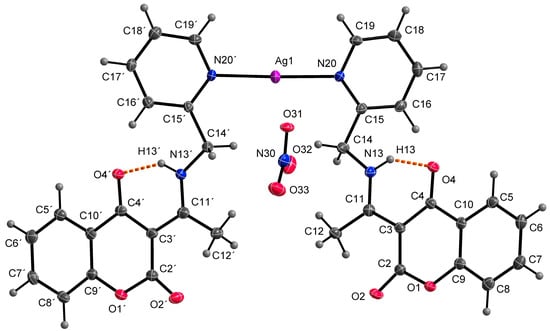 In this work we prepared the novel silver(I) complex [Ag(HL1)2]NO3 (AgHL1) with coumarin derivative (3E)-3-(1-{[(pyridin-2-yl)methyl]amino}ethylidene)-3,4-dihydro-2H-benzopyran-2,4-dione (HL1). The ligand was synthesized through a two-step process. Initially, acetylation of 4-hydroxy-2H-chromen-2-one was carried out using acetic acid in the presence of phosphorus oxychloride [24]. Subsequently, a condensation reaction between 3-acetyl-4-hydroxy-2H-chromen-2-one and 2-picolylamine was taken in methanol to yield the final product, in accordance with the established literature [21,25]. The reaction was performed under reflux conditions, following which the reaction mixture was cooled in a refrigerator for approximately 5 h. A white solid product was then isolated by filtration and air dried. To obtain crystals for X-ray analysis, the ligand was recrystallized from methanol at 24 °C and the identity of crystalline and powder was proved by comparison of their IR spectra. The ligand was then fully characterized by NMR spectroscopy, elemental analysis, and X-ray analysis. The purity of the ligand (from the reflux) was checked by NMR spectroscopy, so the ligand was used in the synthesis of the complex without another purification.