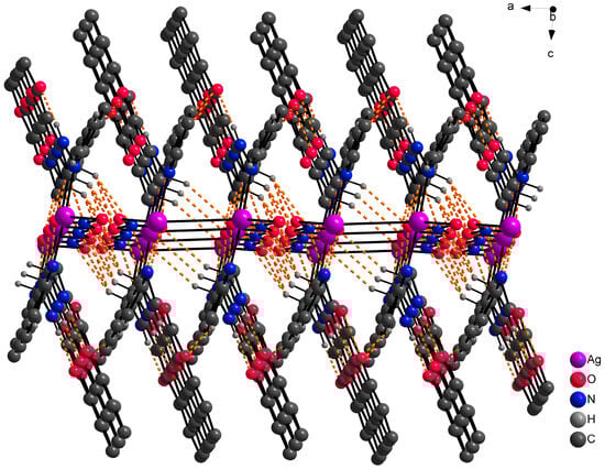 At the outset, it was hypothesized that the ligand HL1 would demonstrate a tridentate bonding mode, involving donor atoms N13, N20, and O4, analogous to complexes with similar coumarin derivatives as previously documented [32,33]. However, the single crystal X-ray analysis of the AgHL1 complex revealed that this assumption was incorrect. In subsequent discussion, we elaborate on the binding mode of the ligand HL1 to the central atom and the structure of the complex AgHL1. The complex crystallizes in a triclinic space group P-1. Two molecules of HL1 are bound to the central Ag1 atom only via N20 (and N20’) atoms, with an average Ag1-N20 bond distance of 2.170(4) Å and the N20-Ag1-N20’ bond angle being 176.69(17)° (Table 3), thus the ligand is monodentate with the donor N20 atom originating from the (pyridin-2-yl)methyl fragment. This aligns with the usual range for Ag-N(pyridyl) bonds, spanning from 1.869 to 2.987 Å [34]. Additionally, Wang et al. [35] reported a complex where the central silver atom is bonded to two nitrogen atoms derived from pyridyl groups. In that complex, the Ag-N bond length is 2.158(4) Å, closely paralleling our findings. However, the N-Ag-N angle in their case is perfectly linear at 180°. As a consequence, atom N13 in AgHL1 remains protonated and, thus, the ligand is electroneutral. The positive charge of the formed complex cation is balanced by the uncoordinated nitrate anion. The shape of the coordination polyhedron is linear (Figure 4). Selected bond lengths and angles are given in Table 3. Due to intermolecular hydrogen bonds and weak interactions (Table 4), the AgHL1 complex creates a 3D structure shown in Figure 5.