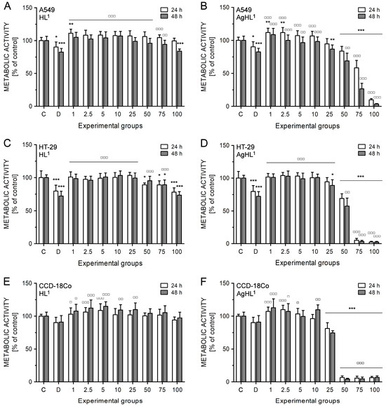 The effect of HL1 (left (A,C,E)) and AgHL1 (right (B,D,F)) on metabolic activity of A549 (top (A,B)), HT-29 (middle (C,D)), and CCD-18Co cell lines (bottom (E,F)). The metabolic activity of the cells was estimated by MTT assay. The analyses were performed 24 and 48 h after the treatment of the cells with HL1 and AgHL1 at concentrations of 1–100 μM (all tested concentrations are shown on the x-axis in μM) and with 1% DMSO (marked as D on the x-axis). The results were evaluated as percentages of the untreated control (marked as C on the x-axis) and are expressed as the mean values ± SD of at least three independent experiments. The groups treated with 1% DMSO, HL1, or AgHL1 were compared with the untreated control (* p < 0.05, ** p < 0.01, *** p < 0.001) and the groups treated with HL1 or AgHL1 were also compared with the group treated with 1% DMSO (□ p < 0.05, □□ p < 0.01, □□□ p < 0.001).