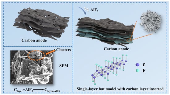 The fluorine (F) and aluminum (Al) elements are also observed between the layers from Figure 1i. This means that AlF3 has entered the interlayer of the carbon anode. When the AlF3 content reaches 7 wt.%, as shown in the red circle in Figure 1h, clusters begin to appear in the interlayer.