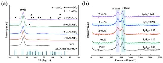 (a) XRD pattern and (b) Raman pattern of carbon anode doped with varying AlF3 contents.