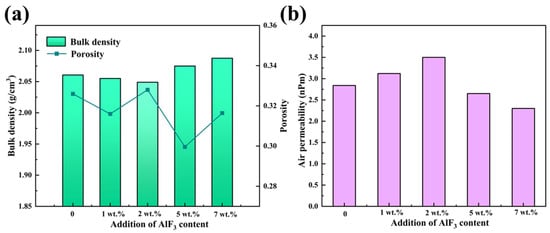 Bulk density and porosity (a) and air permeability (b) of carbon anode doped with varying AlF3 contents.