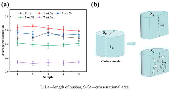 Figure 5a shows the average resistance values of carbon anodes doped with varying AlF3 contents (1 wt.%, 2 wt.%, 5 wt.%, and 7 wt.%). With the increase in AlF3 content, the average resistance value of the carbon anode increases and then decreases. When the content of AlF3 is 1 wt.%, the average resistance value reaches the maximum value (2.65 Ω). This is due to the fact that AlF3 dispersion in the carbon anode affects the arrangement and binding of carbon, thus increasing the barrier for the carbon anode current to pass through, leading to a rise in resistance. AlF3 in the carbon anode also does not interact strongly enough with C and may not be able to sufficiently form a conductive path. And there are more disordered carbon regions or defects in the carbon anode, resulting in limited electron conduction and high resistance.