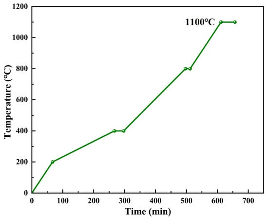 The calcined coke and coal pitch were dried and mixed at 120 °C for 30 min to form a mixture. A total of 65 g of the mixture was weighed and placed into a mold preheated to 130 °C. The mixture was then molded into green anodes with dimensions Φ50 × 20 mm using a hydraulic press. The green anode was placed in a crucible, which was buried in the metallurgical coke((MC Zhenjiang Anode Solutions Co., Ltd., Zhenjiang, China) to ensure that the carbon anode was completely isolated from the atmosphere. The sintering temperature and keeping time were carried out according to Figure 6. As shown in the figure, the temperature was rapidly raised to 200 °C and then slowly rose to 400 °C at a heating rate of 1 °C/min. After 30 min of heat preservation, the temperature was heated to 800 °C at 2 °C/min. After 15 min of heat preservation, the temperature was heated to 1100 °C for 30 min.