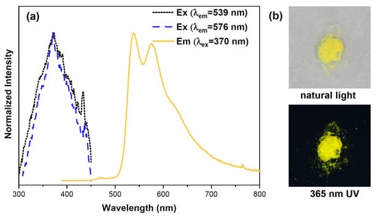 As shown in Figure 2a, under 370 nm excitation, compound 1 exhibited a structured high-energy (HE) emission band at 539 nm and 576 nm in the solid state at room temperature. A weak shouldered peak at around 630 nm was also observed. The excitation spectra of 1 showed negligible changes when the emission wavelength was varied between 539 and 576 nm. The nearly identical PL lifetimes of the two emission peaks (τ = 5.5 μs at 539 nm and 5.8 μs at 576 nm) indicated that they originate from one single emission source. The microsecond range lifetimes suggested that this HE band can be assigned to phosphorescence. The total quantum yield (QY) of the emission was 1.23%, which was observed as a bright yellow PL (Figure 2b).