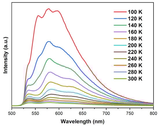 Emission spectra of solid-state 1 (λex = 370 nm) between 100–300 K with 20 K interval.