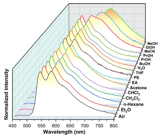 Compound 1 was stable toward UV light (365 nm, 0.5 W, 24 h). The PL response of 1 toward moisture and volatile organic compound (VOC) vapors was investigated. As shown in Figure 5, the emission spectra of 1 in air remained virtually unchanged upon exposure to moisture and VOC vapors including ethyl ether (Et2O), n-hexane, CH2Cl2, CHCl3, acetone, ethyl acetate (EA), petroleum ether (PE), THF, butanol (BuOH), propanol (PrOH), isopropanol (iPrOH), and MeCN. By contrast, the maximum emission wavelength shifted to 615 nm on exposure to EtOH vapor, and then to 645 nm on exposure to saturated MeOH vapor.