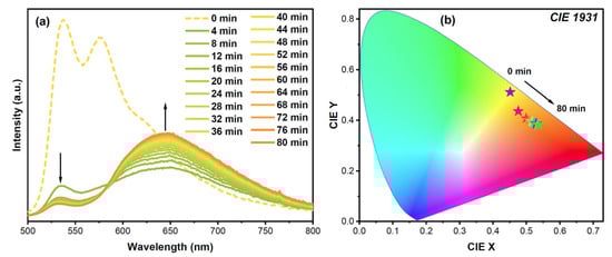 (a) Time-dependent emission spectra of 1 on exposure to MeOH vapor over 80 min at 4 min intervals and (b) the corresponding CIE color space chromaticity diagram (λex = 370 nm).