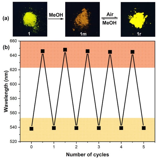 (a) Photographs of 1, 1m and 1r under UV light (365 nm, 0.5 W). (b) Maximum emission wavelengths of 1 over the 5-round MeOH vapor/Air exposure cycles.
