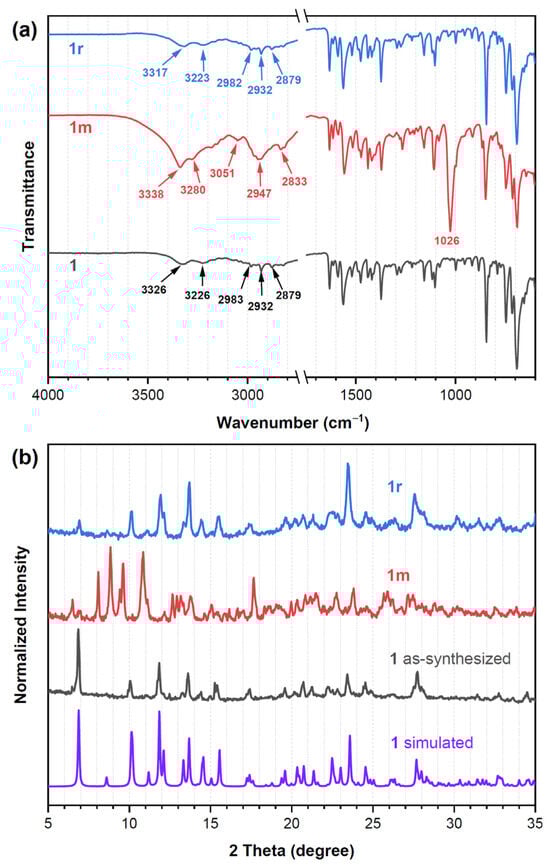Comparisons of (a) the IR spectra and (b) the PXRD patterns of 1, 1m and 1r.