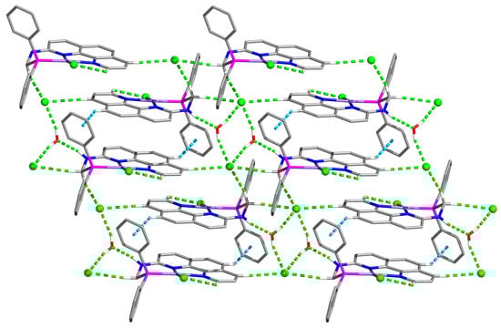 Hydrogen bonds (green dashed lines) and C−H∙∙∙π interactions (blue dashed lines) in 1.