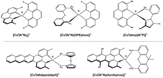 - Zhang, Y.; Schulz, M.; Wächtler, M.; Karnahl, M.; Dietzek, B. Heteroleptic diimine–diphosphine cu(i) complexes as an alternative towards noble-metal based photosensitizers: Design strategies, photophysical properties and perspective applications. Coord. Chem. Rev. 2018, 356, 127–146. [Google Scholar] [CrossRef]
