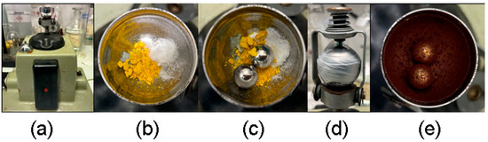 Mechanochemistry: (a) ball milling vibrator device; (b) starting materials added into milling jar; (c) addition of 6 mm stainless steel balls; (d) sealing jar and mounting on ball milling device; (e) product after completion of reaction.