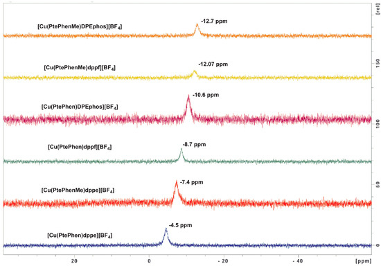 The bite angle of the chelating bisphosphine significantly affects the homoleptic/heteroleptic ratio. Smaller bite angles, such as with dppe, allow the Cu+ centre to accommodate two ligands of this type, facilitating homoleptic complexes [57]. Conversely, wider P-Cu-P angles (113–118°) in ligands, such as with dppf and DPEphos, tend to destabilise homoleptic [Cu(P^P)2]+ complexes [58]. Temperature-dependent 31P NMR studies of complexes C5 and C6 showed that [Cu(PtePhen)(dppe)][BF4] (C5) exhibited no change in its 31P NMR spectrum, even when measured at −60 °C to raise the visibility of minor species (Figure S2, ESI). However, [Cu(PtePhenMe)(dppe)][BF4] (C6) displayed a signal at −7.4 ppm at room temperature and an additional new broad signal at +7.5 ppm at −60 °C, in accordance with previously reported data [56] for [Cu(dppe)2][BF4], which thereby confirms its presence in the solution (Figure S2, ESI).