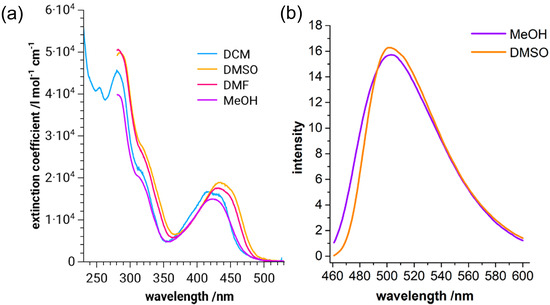 (a) UV-Vis absorption spectra for complex C1; (b) fluorescence emission spectra for complex C1. DCM = dichloromethane; DMSO = dimethylsulfoxide; DMF = dimethylformamide; MeOH = methanol.