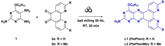 Predominantly inspired by the work of James and co-workers toward the synthesis of salen ligands through ball milling [41], we adopted a relatively similar approach to synthesise our target ligands. Two pteridinyl–phenanthroline derivatives were successfully prepared: 13-(pentyloxy)pteridino [6,7-f][1,10]phenanthrolin-11-amine (L1; PtePhen) and its dimethyl derivative, 3,6-dimethyl-13-(pentyloxy)pteridino[6,7-f][1,10]phenanthrolin-11-amine (L2; PtePheMe). These were synthesised by reacting diamino pteridinyl derivative 1 with 5,6-dione phenanthroline 2 as solids using a standard ball milling vibrator set to a fixed frequency of 50 Hz (Scheme 1; Figure 2a). This mechanochemical method proved effective in providing these relatively complex chemical structures with high purity and in quantitative yields.