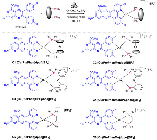 Syntheses of heteroleptic [Cu(PtePhenN^N)(P^P)][BF4] complexes (C1–C6) by ball milling.