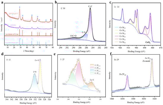 (a) XRD pattern of ZnS/CeO2@CNT material (red stars are the diffraction peak of ZnS and blue stars are the CeO2) and XPS spectra of ZnS/CeO2@CNT material: (b) C 1S, (c) Ce 3d, (d) O 1S, (e) S 2P, (f) Zn 2P.
