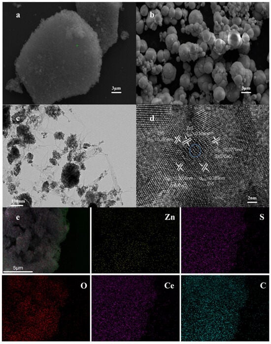 Figure 2a shows the scanning electron microscopy (SEM) image of ZnS/CeO2@CNT, revealing a sponge-like microporous structure formed by the aggregation of CNTs with linear morphology. In contrast, the reference material ZnS/CeO2 (Figure 2b) exhibits distinct spherical particles with significant interparticle voids. The transmission electron microscopy (TEM) analysis (Figure 2c) clearly demonstrates the tubular structure of the CNTs, with ZnS/CeO2 nanoparticles uniformly distributed on the CNT surface. The high-resolution TEM (Figure 2d) displays lattice fringes corresponding to interplanar spacings of d(222) = 0.328 nm, d(400) = 0.366 nm, d(620) = 0.589 nm, and d(331) = 0.389–0.395 nm. The (222) and (400) planes are shared by both ZnS and CeO2 phases, while the (331) and (620) planes are unique to ZnS, confirming the formation of ZnS/CeO2 heterojunctions at the interface regions (blue circles) and throughout the material. Energy-dispersive X-ray spectroscopy (EDS) mapping (Figure 2e) demonstrated a homogeneous distribution of Ce, C, O, and S elements, consistent with the uniform coating of ZnS/CeO2 on CNTs observed in TEM. Quantitative analysis revealed the following composition: Ce: 38.80 wt% (6.92 at%), C: 17.02 wt% (35.43 at%), O: 31.59 wt% (49.37 at%), and S: 8.71 wt% (6.79 at%). The reference ZnS/CeO2 material shows similar elemental distribution patterns (Figure S1), confirming the structural homogeneity of both samples. These results collectively verify the successful construction of the ZnS/CeO2@CNT heterostructure with well-distributed active components on the conductive CNT network [16].