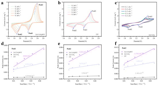CV tests of coin-type half-cells with different materials as sulfur host materials: (a) ZnS/CeO2@CNT, (b) CNT, (c) ZnS/CeO2. Linear fitting of current at different peaks and the square root of scan rate for different materials: (d) Peak 1, (e) Peak 2, and (f) Peak 3.
