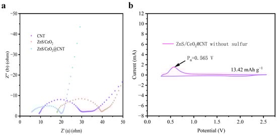 (a) Nyquist plot of EIS test for different materials; (b) CV curve of ZnS/CeO2@CNT material without adding sublimated sulfur in the range of 0-3 V.