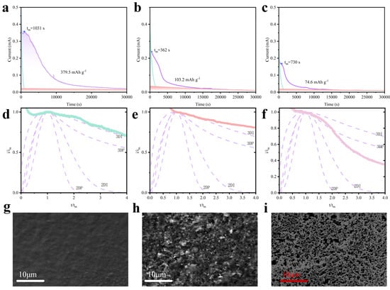 Nonlinear fitting plot of i-t curves obtained when different materials are used as sulfur host materials for lithium–sulfur coin-type half-cells (purple area is the capacity contribution of Li2S4 converting into Li2S; orange area representing the reduction of Li2S6; the green area representing the reduction of Li2S8.): (a) ZnS/CeO2@CNT, (c) ZnS/CeO2, and (e) CNT; comparison of deposition morphologies obtained from i-t curves (purple line is the standardized BFT and SH models, representing different Li2S morphology 3DI, 3DP, 2DI and 2DP.): (b) modified i-t curve of ZnS/CeO2@CNT (green), (d) modified i-t curve of ZnS/CeO2 (orange), and (f) modified i-t curve of CNT (pink). SEM images of electrodes after initial discharge: (g) ZnS/CeO2@CNT, (h) ZnS/CeO2, and (i) CNT.