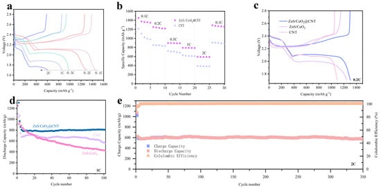 (a) First charge-discharge curves of ZnS/CeO2@CNT material at different rates; (b) comparison of rate performance between ZnS/CeO2@CNT and CNT materials; (c) First charge-discharge curves of various materials at 0.2C rate, blue for ZnS/CeO2@CNT, purple for ZnS/Ceo2, pink for CNT; (d) discharge cycle performance of various materials at 1C rate, with the first three cycles being activated at 0.2C rate; (e) long-term cycling performance of ZnS/CeO2@CNT material at a high rate of 2C, with the first two cycles being activated at 0.2C.