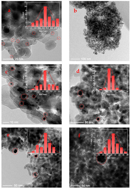 TEM images and particle size statistical results of 2-Pt/TiO2 (a) and (b), 4-Pt/TiO2 (c), 10-Pt/TiO2 (d), 15-Pt/TiO2 (e) and 41-Pt/TiO2 (f) catalysts, respectively.