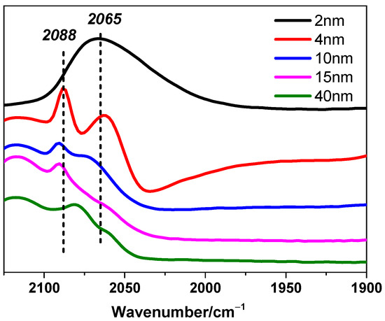 It should be noted that this inference is based on necessary but reasonable assumptions, which are crucial for the generalized model we proposed before. Supported crystalline metal grains should present similar figures and uniform packing structures even if the size changes. In addition, active sites that are located in the same kind of areas on Pt particles, to be more specific, including surface parts, interfacial/edge parts, or corner parts, should perform uniform or approximate activity, respectively. However, the assumption about uniform activity might correspond to all cases. Here is a typical counterexample reported that for CH4 reactions with CO2 or H2O over supported Pt clusters, CH4 turnover rates over surface Pt sites are different on Pt clusters with different sizes [3]. These two hypotheses may narrow the range of applicability but significantly enhance reliability. Fortunately, the CO-DRIFTS results shown in Figure 5 indicate that the Pt nanoparticles in this study exhibit relatively uniform adsorption behavior, supporting the rationale and necessity for the assumptions of uniform shape and activity. Linear CO adsorption signals were observed between 2000 and 2100 cm−1, with peaks around 2088 cm−1 and 2065 cm−1 corresponding to CO adsorption on Ptδ+ and Pt0 sites, respectively. Similar adsorption signals have been reported for other Pt-based catalysts [35,36], further validating these findings.