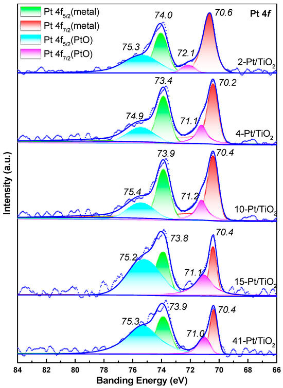 XPS analyses were also carried out, and peak–deconvolution of the Pt 4f region (Figure 6) shows virtually identical binding energies for both metallic Pt0 (4f7/2 ≈ 71.2 eV) and the slightly oxidized Ptδ+ component (4f7/2 ≈ 72.0 eV) across all Pt/TiO2 catalysts. This uniform valence–state distribution further substantiates our assumption of consistent particle morphology and comparable per-site activity.
