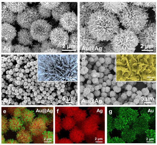 (a,b) SEM images of Ag HSs, (c,d) SEM images, and (e–g) elemental mappings of Au@Ag HSs. The inset images in the top right corner of (b,d) are magnified SEM images (shown in pseudocolor).