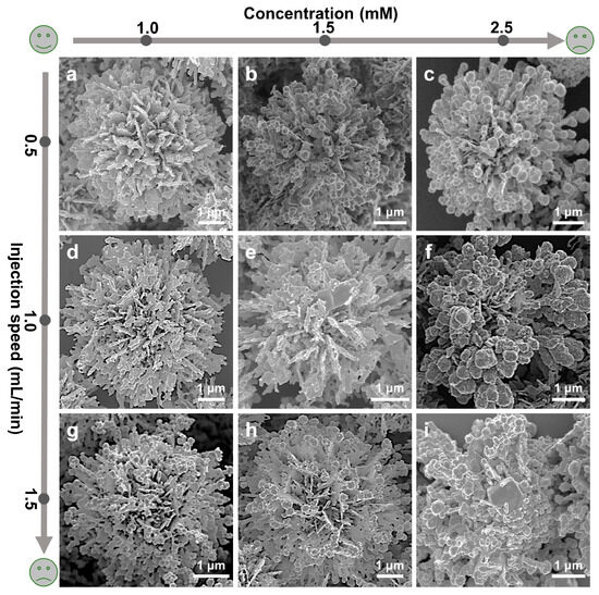 High-magnification SEM images of Au@Ag synthesized at different injection rates and injection concentrations, (a) 1.0 mM, 0.5 mL/min, (b) 1.5 mM, 0.5 mL/min, (c) 2.5 mM, 0.5 mL/min, (d) 1.0 mM, 1.0 mL/min, (e) 1.5 mM 1.0 mL/min, (f) 2.5 mM 1.0 mL/min, (g) 1.0 mM 1.5 mL/min, (h) 1.5 mM 1.5 mL/min, (i) 2.5 mM 1.5 mL/min.