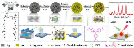 To address these issues, researchers have developed various optimization strategies to enhance the stability and SERS performance. These include the fabrication of high-density Ag nanoparticles (NPs) arrays [12], surface modification [13], and the creation of composite SERS substrates [14]. These strategies can alter the electronic structure and chemical stability, thereby improving oxidation resistance. However, these strategies may also involve complex fabrication processes, the introduction of materials with poor inherent SERS performance that can negatively impact the overall SERS activity, and high costs that hinder large-scale fabrication and application. Relatively, depositing Au on Ag surfaces to create core–shell structures is an effective strategy [15]. It not only serves as a protective layer to prevent Ag oxidation [16] but also, more importantly, combines the properties of Au and Ag to generate a stronger surface plasmon resonance, thereby enhancing the SERS signal [17]. The main strategies for preparing gold-coated silver include in situ reduction [18], seed-mediated growth [19], and metal deposition methods [20]. While these methods can effectively synthesize Au@Ag structures, they are typically limited to conventional Ag morphologies such as spheres [21], wires [22], and plates [23,24]. Extending these approaches to fabricate architecturally complex Ag@Au nanomaterials often proves challenging. Conspicuously, unlike the relatively straightforward preparation of silver-coated Au structures [25], the synthesis of gold-coated Ag structures while preserving the template’s intricate Ag architecture presents significant difficulties due to Ag’s higher chemical reactivity than Au [26,27]. In most cases, the high reactivity of Ag compared to Au often leads to morphological damage of Ag during the preparation process, significantly affecting the material’s inherent SERS activity. Developing more effective methods to fabricate complex gold-coated Ag structures and to demonstrate their structure-related high SERS activity is of great significance, yet it faces considerable challenges at this stage.