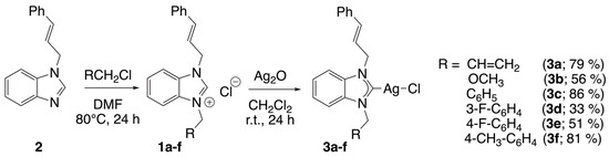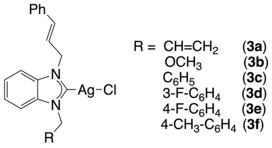 Six silver(I) complexes (3a-f), namely chloro[1-cinnamyl-3-allyl-benzimidazol-2-yliden]silver(I) (3a), chloro[1-methoxymethyl-3-cinnamyl-benzimidazol-2-yliden]silver(I) (3b), chloro[1-benzyl-3-cinnamyl-benzimidazol-2-yliden]silver(I) (3c), chloro[1-(3-fluorobenzyl)-3-cinnamyl-benzimidazol-2-yliden]silver(I) (3d), chloro[1-(4-fluorobenzyl)-3-cinnamyl-benzimidazol-2-yliden]silver(I) (3e) and chloro[1-(4-methyl-benzyl)-3-cinnamyl-benzimidazol-2-ylidene]silver(I) (3f), were obtained in satisfactory yields (33–86%) from a reaction of Ag2O with the benzimidazolium salt (1a–f) in dichloromethane for 24 h at room temperature, with the reaction protected from light by aluminum foil (Scheme 1). The benzimidazolium salts 1a–f were previously prepared by alkylation of 1-cinnamyl-benzimidazole (2) and aryl chloride. Note that the alkyl substituents grafted on the benzimidazole only slightly modify the σ-donor properties of the N-heterocyclic carbenes. Indeed, the 1JCH constants demonstrate minimal variability within the range of 220–225 Hz (Table 1). This finding indicates that these ligands exhibit weak σ-donor properties, which are comparable to those of 1,3-dicyclohexyl-imidazolium salt [38].