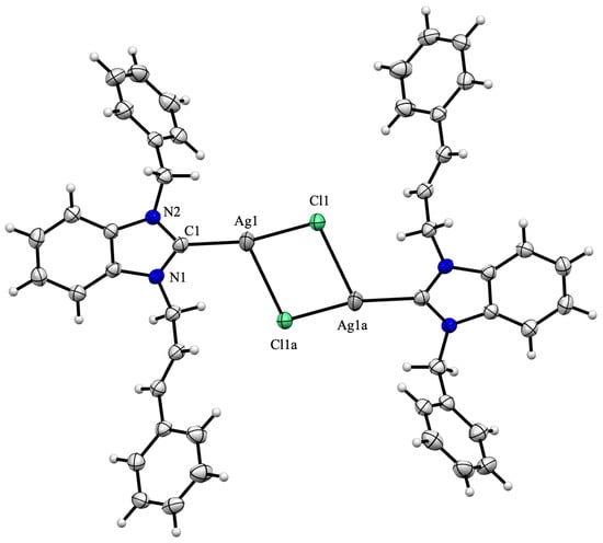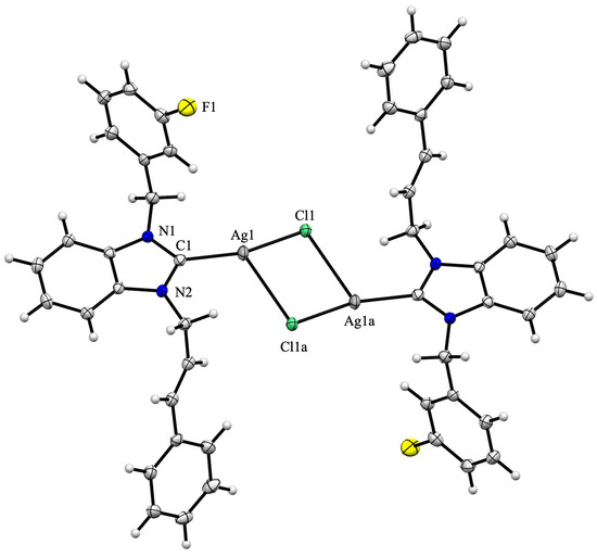 The formation of dimers is achieved through the establishment of an additional Ag–Cl bond (Ag1–Cl1a of 2.968(3) and 2.9320(6) Å for complexes 3c and 3d, respectively), which are substantially longer than the direct Ag1–Cl1 bond (Ag1–Cl1 of 2.3854(13) and 2.3972(5) Å for complexes 3c and 3d, respectively) (Figure 2 and Figure 3). Dimer formation is frequently observed during the crystallization of (NHC)Ag-Cl complexes, as evidenced in chloro[1-(9-acridinyl)-3-methylimidazol-2-yliden]silver(I) [42] or chloro[1-(N,N-diethylcarbamoylmethyl)-3-mesitylimidazol-2-ylidene]silver(I) [43] complexes.