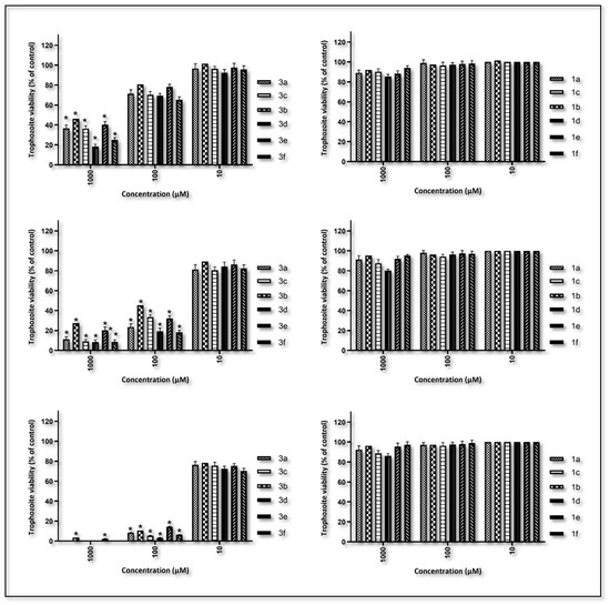 Overall, efficacy was reduced at 100 µM, but a similar trend was observed. Complexes 3c, 3d and 3f exhibited significant activity, with 5.3, 3.2 and 6.3% trophozoite viability, respectively, recorded after 72 h (p < 0.05). Ligands at the same concentration did not demonstrate any inhibitory effects. At the lowest tested concentration (10 µM), the complexes displayed minimal activities. All ligands yielded viability rates comparable to those of the untreated control group.