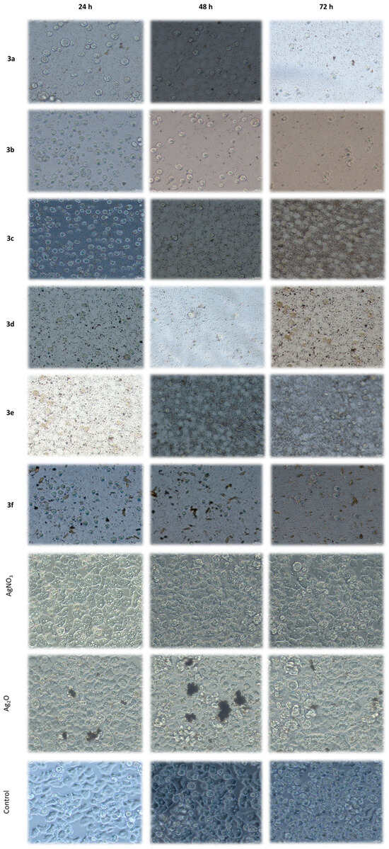 Inverted microscope images showing the viability of A. castellanii trophozoites treated with 1000 µM concentrations of silver(I) complexes (3a–f), AgNO3 and Ag2O after 24, 48 and 72 h (magnification: 200×).