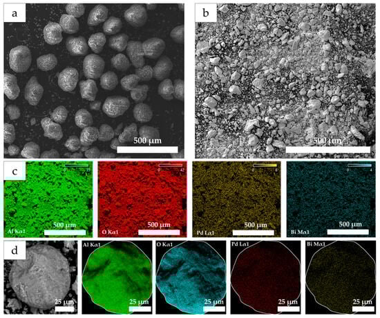 SEM micrographs for γ-Al2O3 (a) and Pd10:Bi1/Al2O3 (b) and element maps for Pd Lα1 and Bi Mα1 obtained by the SEM-EDS on powder (c) and a separate granule (d) of the Pd10:Bi1/Al2O3 sample.