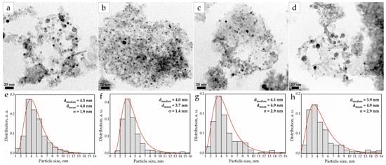 To measure the size of the observed nanoparticles, particle size distribution (PSD) was performed for all the samples (Figure 2e–h). The distribution patterns obey the log-normal distribution law. The average and median diameters of the catalyst particles were 4–5 nm. All the samples exhibit a relatively narrow particle size distribution in the range from 2 to 8 nm. A negligible number of larger nanoparticles (>10 nm) are present in all the samples, which indicates some degree of particle aggregation during the synthesis [35]. However, their contribution to the average particle diameter is insignificant. Consequently, the influence of the particles of such a size on the overall catalytic activity will be minimal, due to the very low active surface of such particles [36]. The high dispersion of small particles suggests a more developed specific surface area of the catalyst, which, as a rule, has a positive effect on its catalytic activity.