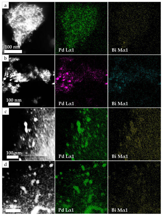 Element maps for Pd Lα1 and Bi Mα1 obtained by the TEM-EDS for catalyst samples: Pd5:Bi1/Al2O3 (a), Pd10:Bi1/Al2O3 (b), Pd15:Bi1/Al2O3 (c) and Pd20:Bi1/Al2O3 (d).