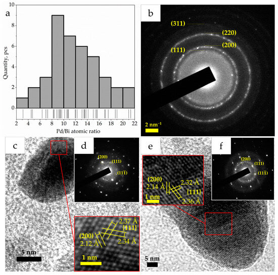 Distribution of Pd10:Bi1/Al2O3 particles by Pd/Bi atomic ratio (a), SAED pattern Pd10:Bi1/Al2O3 (b), HRTEM micrographs of individual particles of Pd5:Bi1/Al2O3 (c) and Pd20:Bi1/Al2O3 (e) and SAED patterns obtained from these particles (d,f).