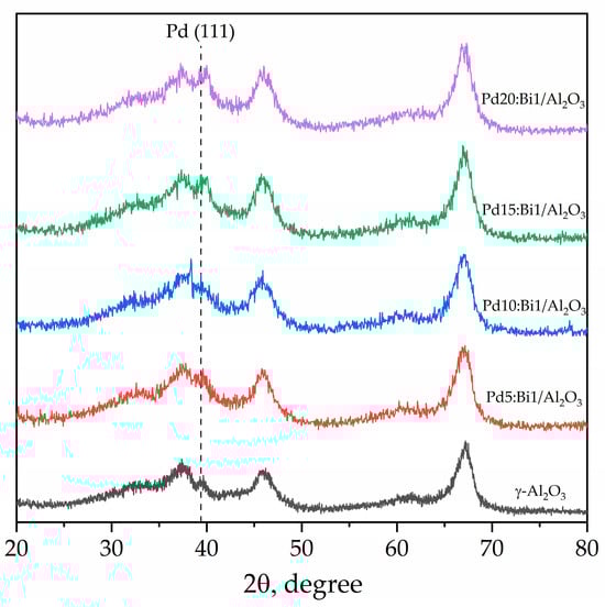 The structure of the samples was additionally confirmed using the powder X-ray diffraction (XRD) method. The obtained diffractograms (Figure 5), unfortunately, are not informative for us, since the Pd and Bi reflexes we are interested in are mainly in the regions where the γ-Al2O3 reflexes, which have a high degree of amorphousness and sufficiently wide peaks, are found. Nevertheless, the most intense Pd (111) reflex is observed at 39.4°, and its intensity increases with increasing Pd content. It is also interesting that although the Bi additive is quite small, the region in which we could expect its most intense peak (COD 1539906; (200); 2θ = 28.5°) is not characterized by any reflexes (including γ-Al2O3) [43]. This may also further indicate that Bi forms a solid solution with Pd, the particles of which crystallize in the fcc structure of Pd.