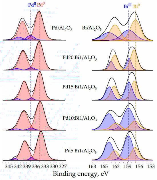 XPS was used to study the valence state of the metal particles on the surface of Pd-Bi catalyst samples (Figure 6). The spectra deconvolution was performed to interpret the obtained results. The XPS profiles for monometallic Pd/Al2O3 consist of two peaks related to the Pd 3d3/2 and Pd 3d5/2 states with the binding energies of 340.4 eV and 334.9 eV, respectively. The XPS profile for the Pd 3d5/2 core level contains lines at 337.8 eV and 334.9 eV that correspond to the PdII and Pd0 states, respectively (Table 1) [45,46]. The XPS spectrum of the monometallic Bi/Al2O3 of the Bi 4f7/2 core level consists of two peaks related to the BiIII and Bi0 states with binding energies of 158.7 eV and 156.9 eV, respectively [47,48]. The presence of the oxidized form of Pd and Bi in both monometallic samples and, as will be shown later, in bimetallic ones is inevitable due to the strong adsorption of metals on the surface of the oxygen-containing support γ-Al2O3 during synthesis [49]. In addition, both metals can undergo partial oxidation under the influence of X-ray radiation in the XPS analysis chamber.