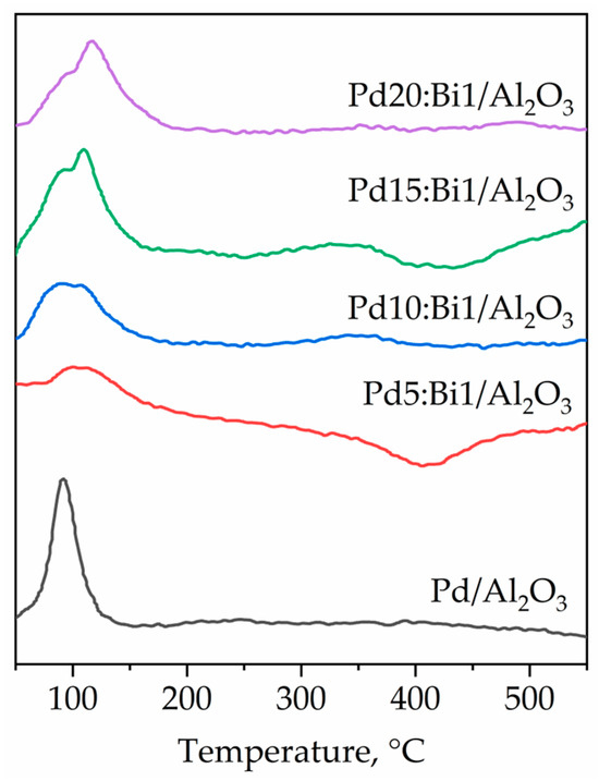 Temperature-programmed reduction with hydrogen (TPR-H2) profiles of Pd-Bi catalysts along with the corresponding reference Pd/Al2O3 sample are shown in Figure 7. In the TPR profile of the monometallic Pd/Al2O3 sample, there is a single peak of reduction of the oxidized state of PdOx at 100 °C [23]. In the case of Pd-Bi catalysts, the peaks of H2 absorption of an uneven shape are observed in the temperature range of 50–150 °C [50]. The peaks at ≈92 °C are associated with the reduction of PdO due to hydrogen absorption. However, the appearance of the additional absorption peaks at 120–135 °C is probably related to the reduction of the mixed form of Pd-O-Bi. The “humped” shape of the curves at 50–150 °C indicates different dispersion of the nanoparticles and different contributions of both larger particles and smaller ones. A similar pattern was found for active gold centers of different types: gold clusters and gold nanoparticles with different sizes and effective charges [51]. Owing to the small amount of the introduced Bi in the samples in the temperature range from 300 to 400 °C, there are low-intensity bands of reduction of monometallic Bi species, which indirectly confirm the presence of monometallic Bi particles in an extremely small amount.
