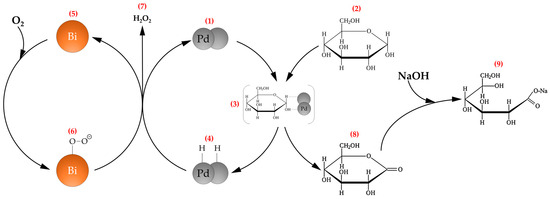 Speaking about the mechanism of the reaction of catalytic oxidation of glucose to gluconic acid on Pd-Bi catalysts, the mechanism proposed by Besson et al. [52] is generally accepted and most often used for description. (Figure 8). According to this mechanism, Bi acts as a promoter protecting active Pd sites from deactivation, while Pd0 has catalytic activity in this process. The active sites of metallic Pd (1) are targets for glucose adsorption (2) through H- and OH-groups (3, 4), and Bi (5), which has a higher affinity for oxygen than Pd, is an acceptor of the oxygen molecule (6). The interaction of adsorbed hydrogen and oxygen leads to the release of hydrogen peroxide molecules into the reaction media (7), and glucose is transformed into an intermediate product, glucono-δ–lactone (8), which is subsequently destroyed by an added solution of sodium hydroxide to form a molecule of sodium gluconate (9).