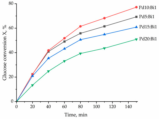 Therefore, it is possible to conclude that a certain amount of Bi is necessary for the effective modification of Pd and optimization of catalytic properties. An excessively low Bi content does not provide a sufficient promoting influence, which leads to a decrease in the catalyst efficiency. The revealed regularities denote the existence of an optimal Pd:Bi ratio, at which the maximum efficiency is achieved during selective oxidation of glucose.