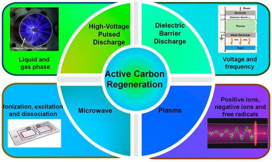 As a result, plasma regeneration technology has become a global research focus in the field of AC regeneration. Several methods of plasma generation exist, including high-voltage pulsed discharge, DBD, microwave discharge, and electric corona discharge. Discharge plasmas can regenerate saturated AC under gaseous or liquid-phase conditions through the action of high-energy electrons. This work summarizes the mechanisms, application conditions, and effects of AC regeneration based on plasma technology. Particular emphasis is placed on high-voltage pulsed discharge and DBD techniques, which have gained considerable popularity in recent years. The outcomes of AC regeneration using plasma technology are presented, and the potential for coupling plasma technology with other methods to enhance regeneration efficiency, which focuses on thermal regeneration versus thermal reactivation, is discussed, highlighting future prospects.